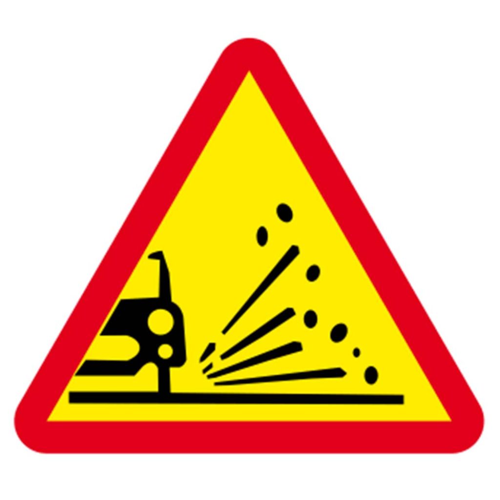Indicatorul rutier din imaginea alăturată, se întâlnește pe sectoarele de drum unde se execută lucrări pe partea carosabilă. La întâlnirea indicatorului "Împroșcare cu pietriș", conducătorului auto îi este recomandat să păstreze o distanță mai mare față de vehiculul care circulă înaintea sa.