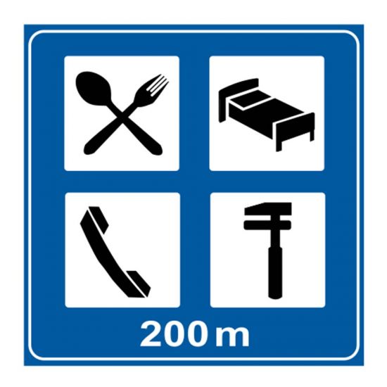 Indicator de informare G33 complex de servicii dimensiuni: 1400x1400 mm aceste indicatoare rutiere se întâlnesc în apropierea unor complexe de servicii (restaurant, hotel, telefon, service auto).