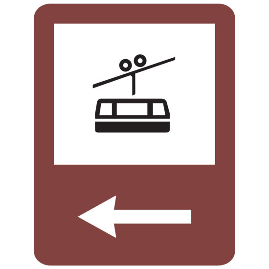 Indicator de informare turistica T11 telecabina 650x500 mm folie reflectorizanta clasa 1 otel vopsit aceste indicatoare rutiere de informare turistică, se adresează conducătorului de vehicul, informându-l cu privire la direcția pe care trebuie să o urmeze spre telecabină.