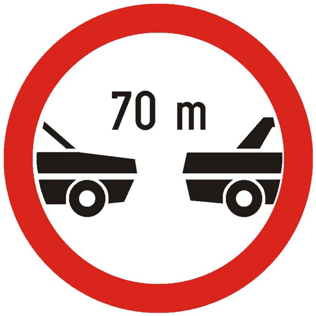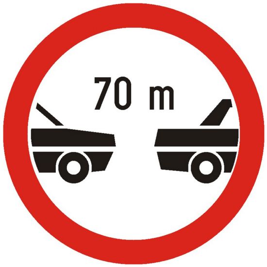 Indicator de interzicere sau restrictie C21 interzis autovehiculelor de a circula fara a mentine intre ele un interval de cel putin 600 mm folie reflectorizanta clasa 1 otel vopsit se instaleaza pe sectorul de drum unde trebuie pastrata o distanta minima intre autovehicule. Poate fi insotit de un panou aditional pe care este inscrisa lungimea sectorului de drum pe care se impune restrictia. Raza de actiune a indicatorului se termina la intalnirea indicatorului Sfarsitul tuturor restrictiilor.