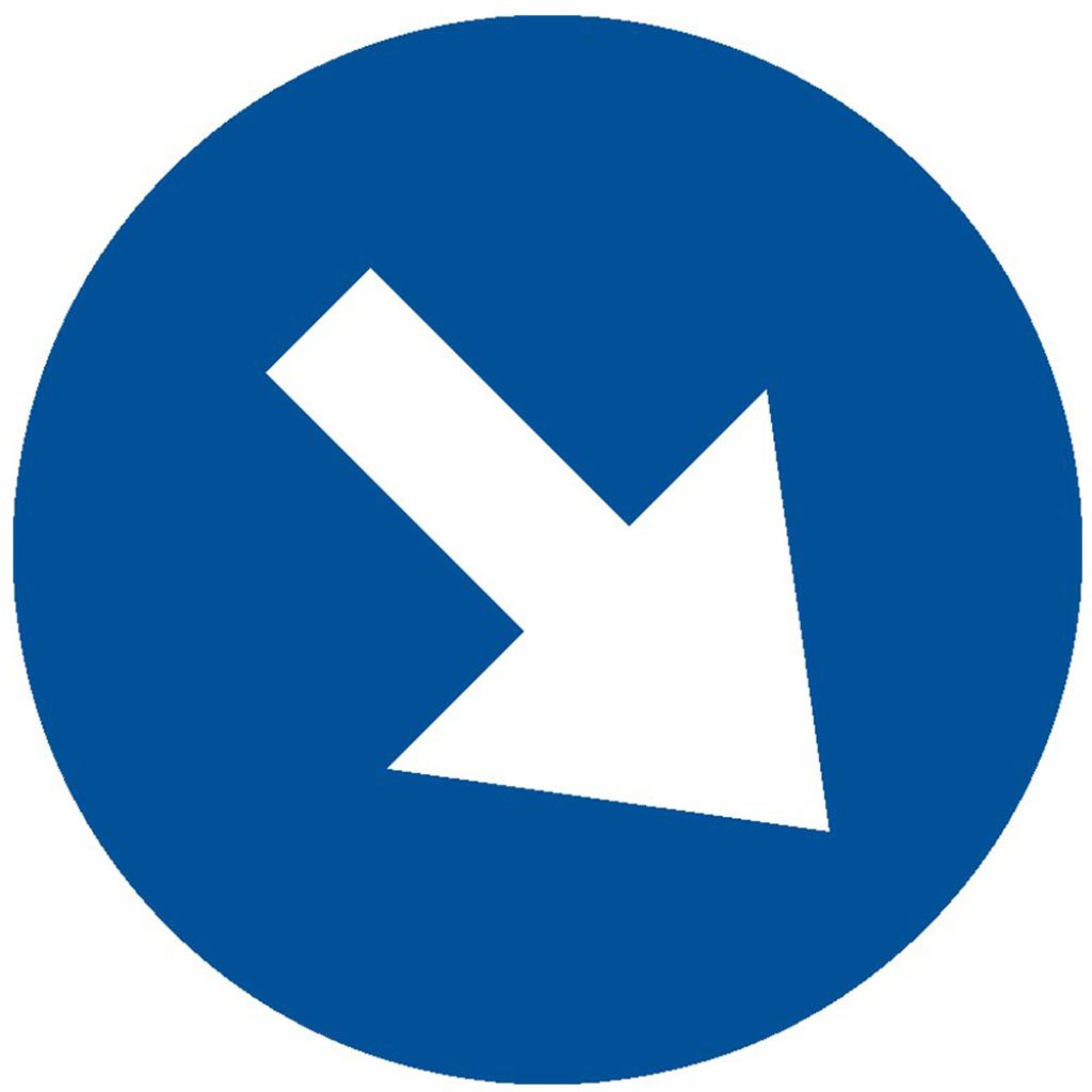 Indicator de obligare D5 ocolire Dreapta 600 mm folie reflectorizanta clasa 1 otel vopsit se amplaseaza inaintea unui obstacol aflat pe partea carosabila, pe care conducatorul auto trebuie sa il ocoleasca in sensul indicat de sageata. Refugiile statiilor de tramvai sunt semnalizate cu astfel de indicatoare.
