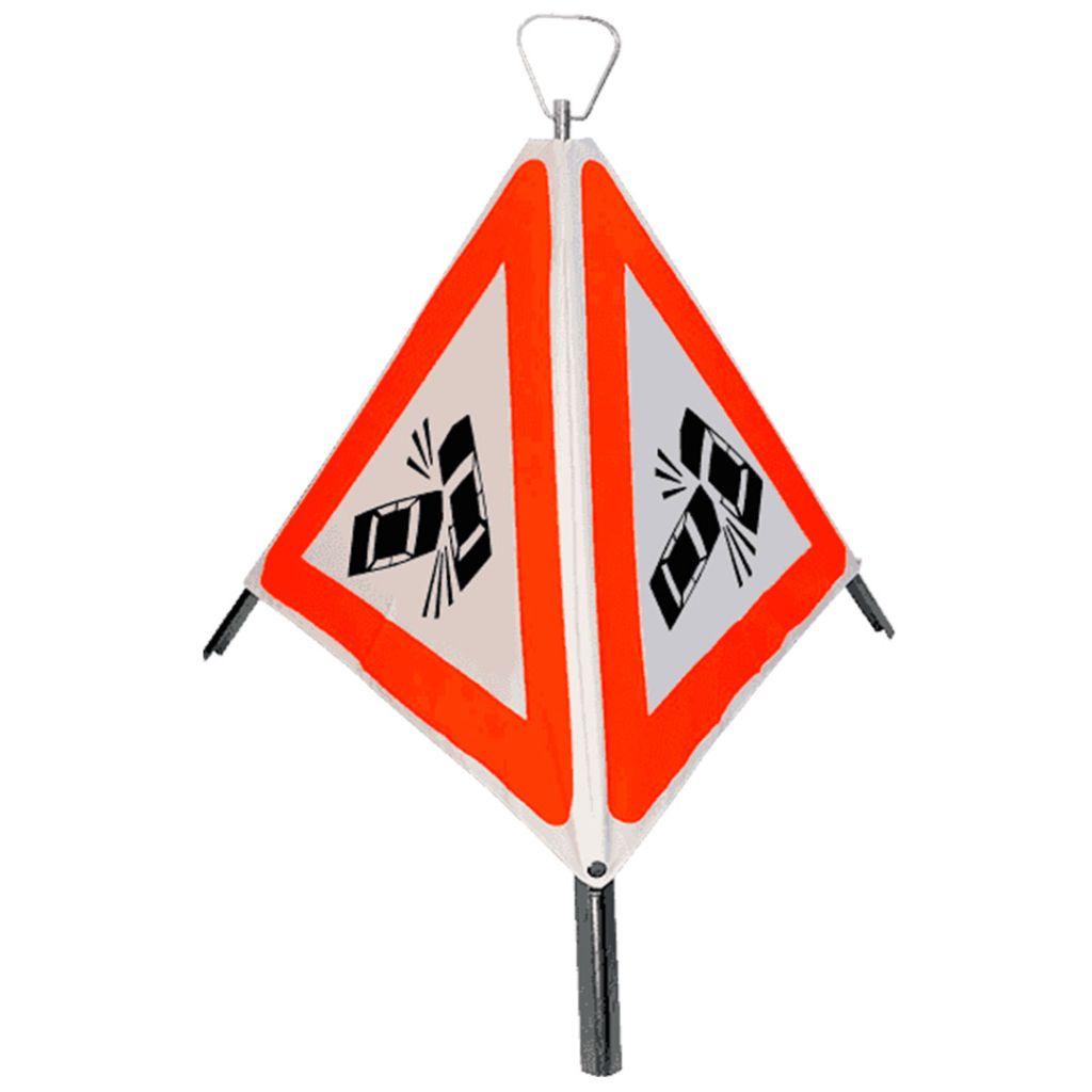 Este un panou rutier temporar cu structură pliabilă și 3 fețe de avertizare.