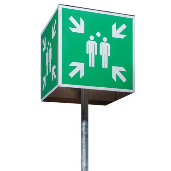 Panoul indicator cub loc de adunare în caz de urgență 300x300 mm din aluminiu este o soluție profesională pentru semnalizarea punctelor de evacuare în exterior. Datorită designului cubic, oferă vizibilitate din toate direcțiile și ajută la organizarea eficientă a persoanelor în situații de urgență.
