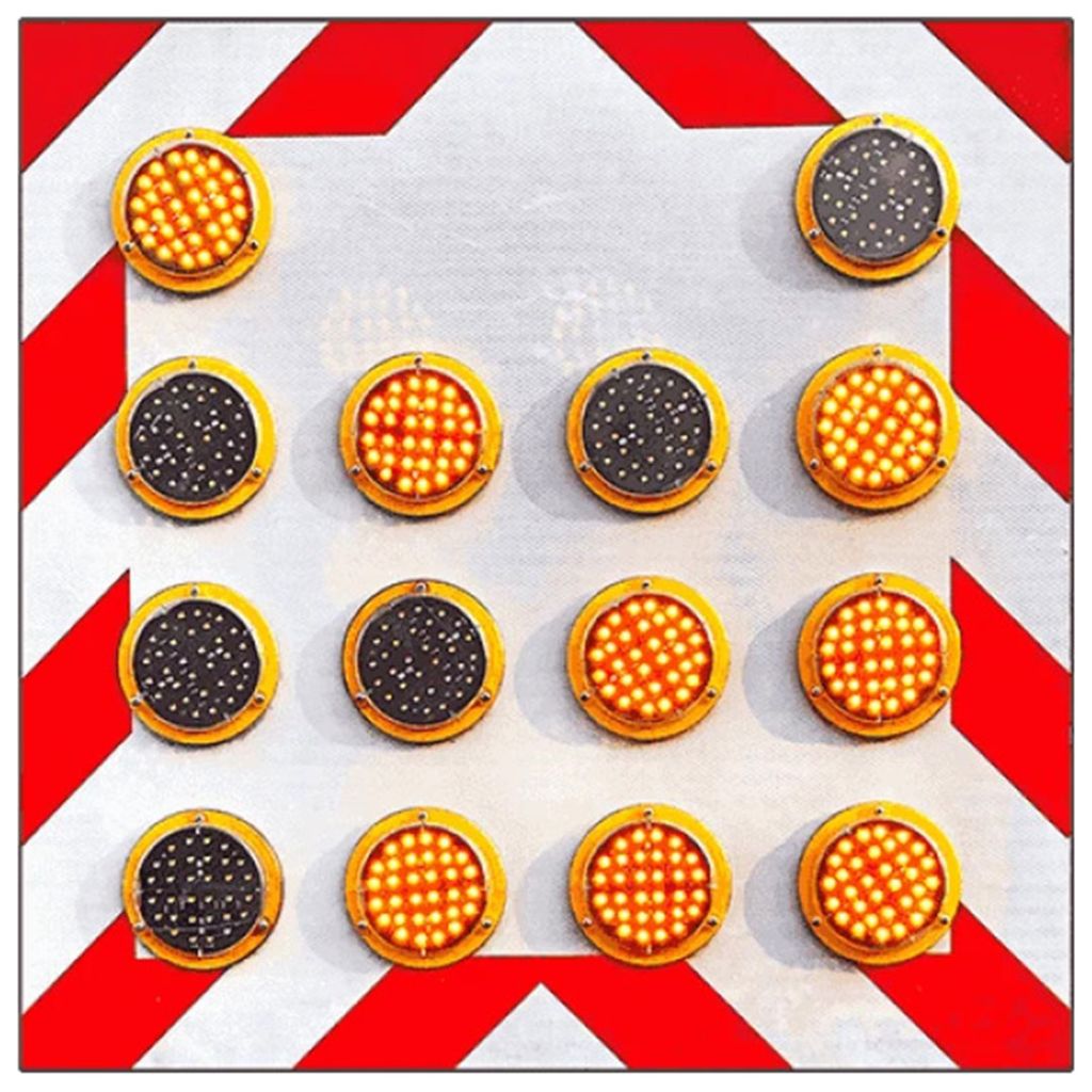 Panoul rutier are o suprafață de 900×900 mm, optimizată pentru a corespunde reglementărilor de semnalizare rutieră. Folia reflectorizantă de clasa 2 asigură o reflectivitate crescută, vizibilă din distanțe mari chiar și în condiții de lumină scăzută sau ploaie. Aceasta se combină cu 13 LED-uri de înaltă intensitate, care generează semnale luminoase distincte, percepute rapid de șoferi.