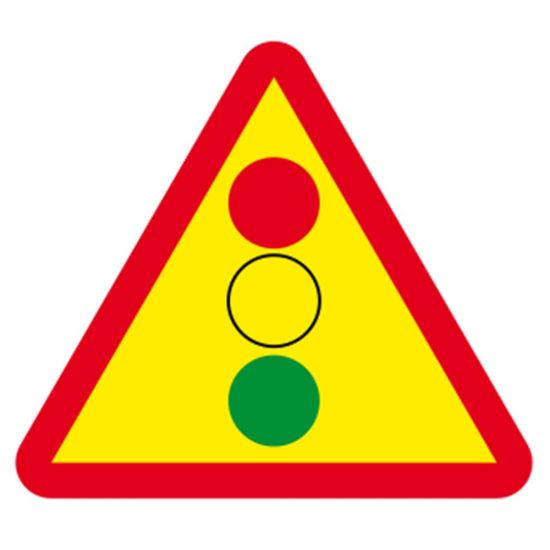 Acest indicator rutier se întâlnește pe sectoarele de drum unde se execută lucrări și îi informează pe participanții la trafic că urmează o intersecție semaforizată.