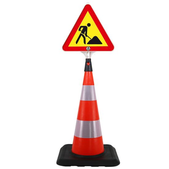 Un set con rutier de 750 mm cu indicator pentru lucrări este un sistem de semnalizare temporară compus din con rutier înalt de 750 mm și panou/semn de avertizare montat pe partea superioară.