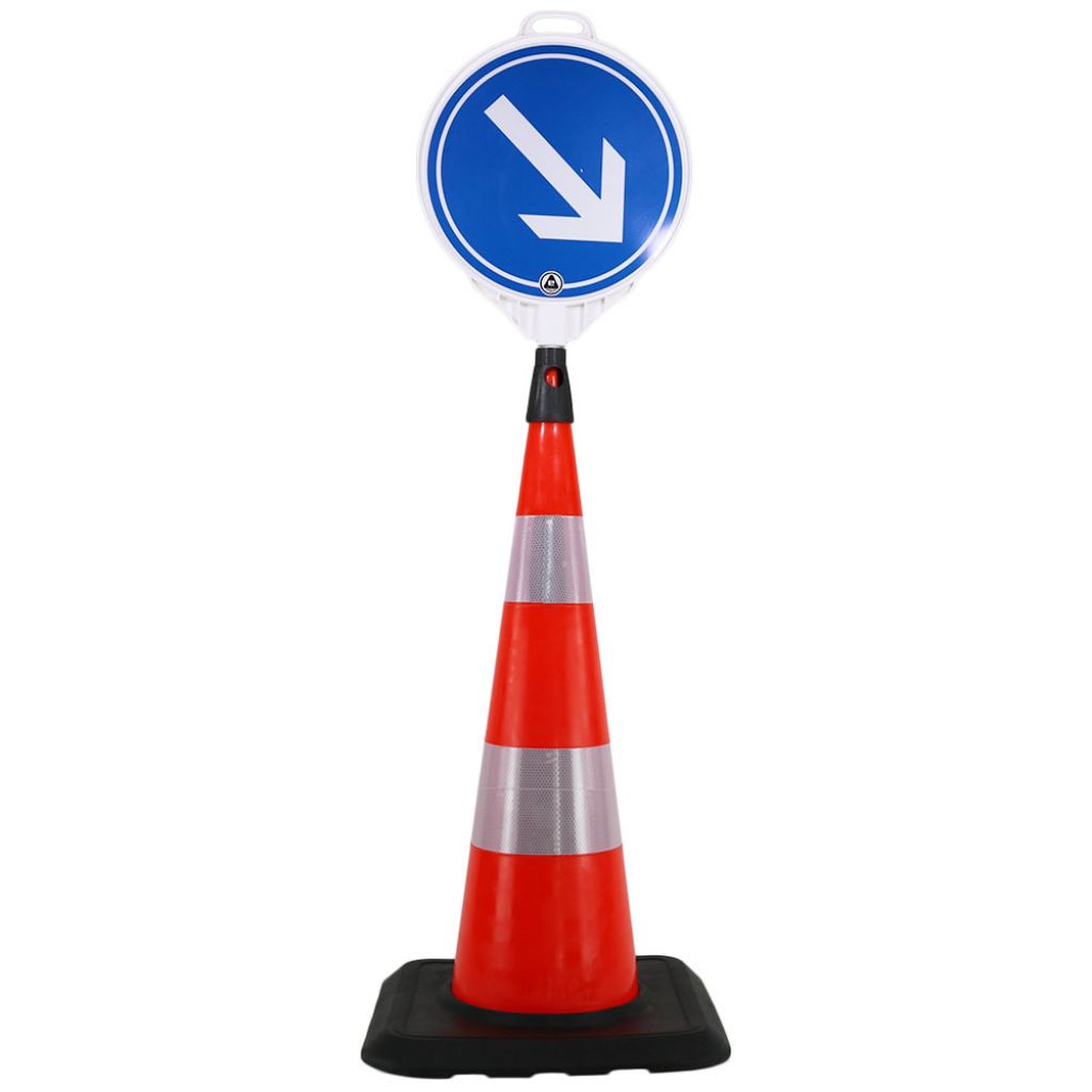 Un set con rutier de 900 mm cu indicator pentru ocolire pe partea dreaptă este un sistem de semnalizare temporară utilizat pentru dirijarea traficului în zone cu lucrări sau obstacole. Acesta combină conuri de înălțime mare cu panouri reflectorizante pentru a ghida șoferii în siguranță, vizibilitate ridicată zi și noapte și conformitate cu normele de siguranță rutieră.
