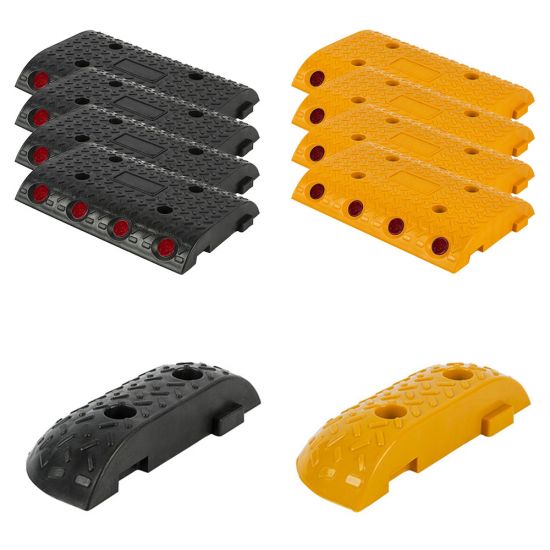 Set limitator de viteza din plastic cu catadioptrii pentru strada de 3 metri compus din 8 limitatoare de viteza, culori negru si galben, dimensiune 250x350x50 mm, si 2 capace de limitator de viteza, dimensiune 250x100x50 mm, pentru un total de 3 metri.