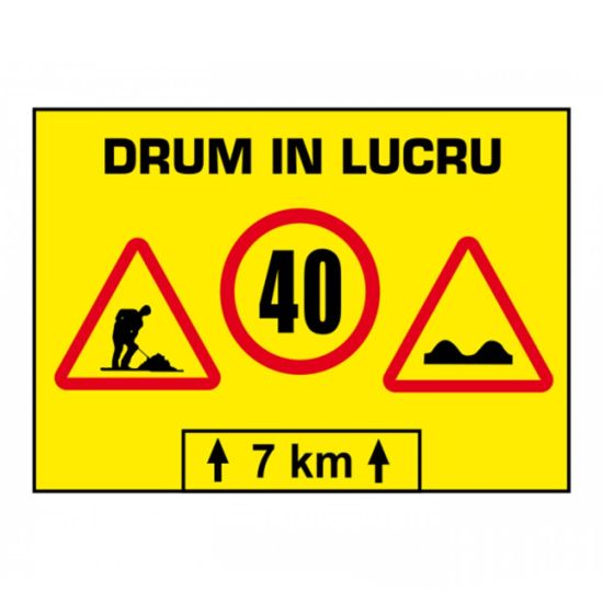 Indicatorul rutier din imaginea alăturată, semnalizează o succesiune de puncte de lucru pe o distanță de 7 kilometri. Conducătorii auto sunt obligați să nu circule cu o viteză mai mare de 40 km/h.