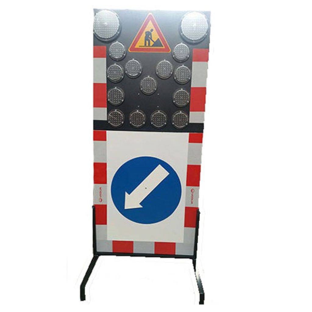 Panou indicator rutier pentru lucrări 1200x2500 mm, semnalizare luminoasa cu LED, montaj pe stâlpi mobili și contravântuire